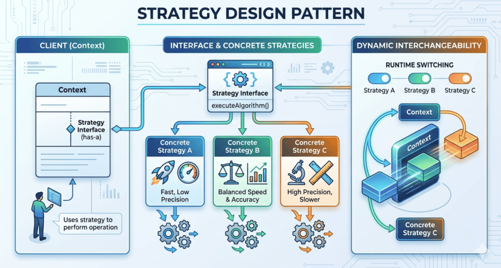 Strategy pattern is a behavioral design pattern, where a strategy represents a way of doing a specific thing. Different strategies represent different ways of doing a thing, based on differing context. In our case, if user wants to do a Credit card payment, we will make use of CreditCard payment class/strategy, if user wants to make use of DebitCard payment then he shall make use of DebitCard payment class/strategy and accordingly for others.